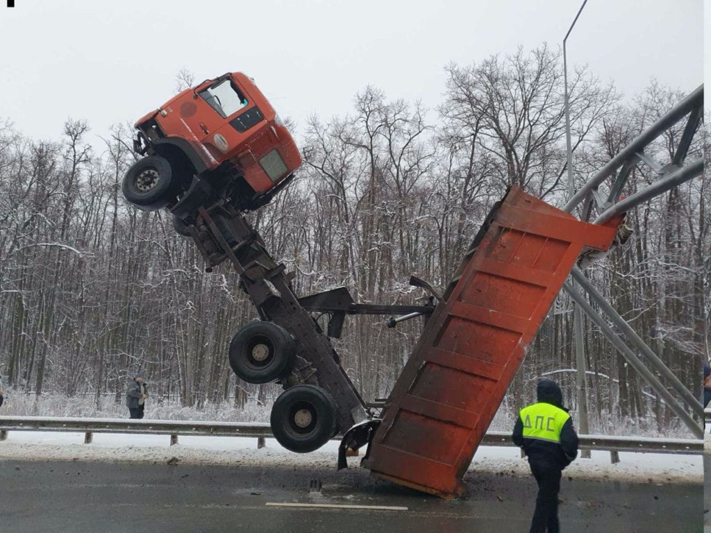 Водитель грузовика забыл опустить кузов и завис над дорогой (фото)