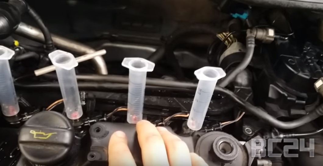 Внимательно следим, чтобы не было утечки. Это очень важно. Вот уже отчетливо видно, что 4-я форсунка сливает больше чем все остальные.
