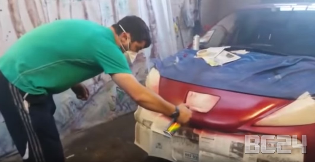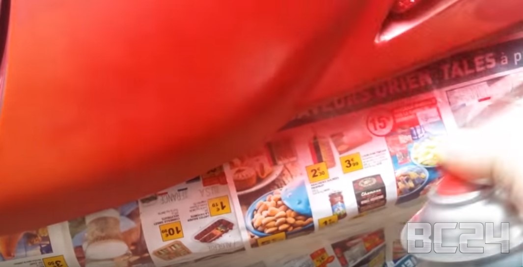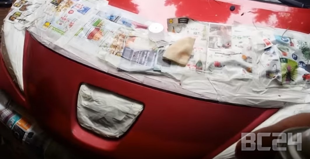 Очень тщательно встряхиваем и укрываем кузов с помощью скота и газет. Для того чтобы на определенные участки кузова не попала краска с баллончика.