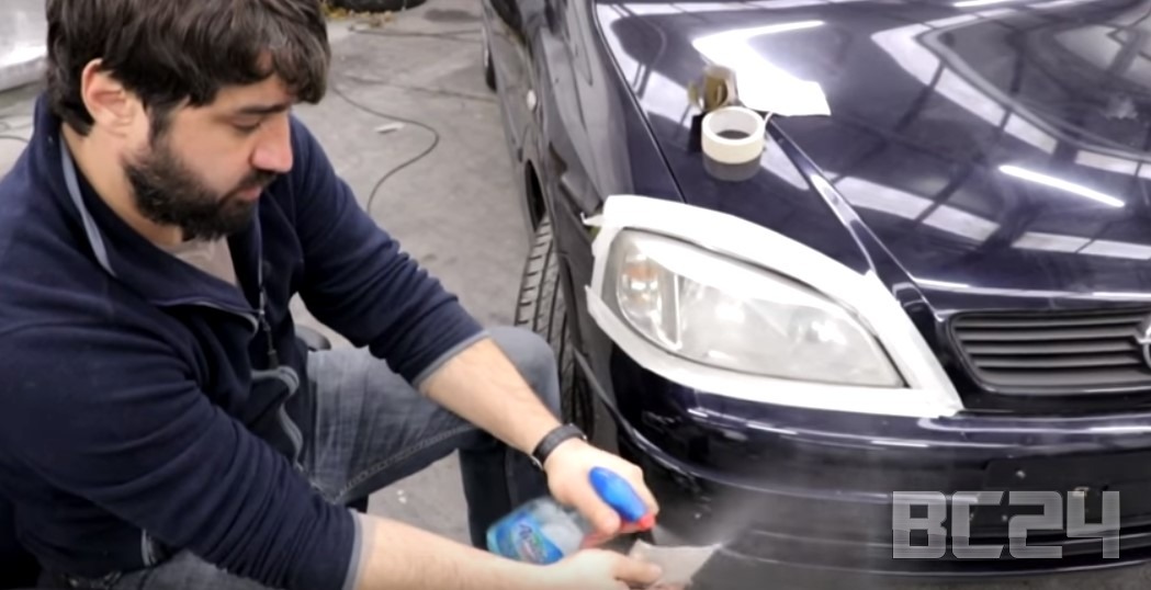 Берем шпатель, полироль и микрофибру и начинаем наносить полироль на фару. После этого берем микрофибру и начинаем полировать фару круговыми движениями.