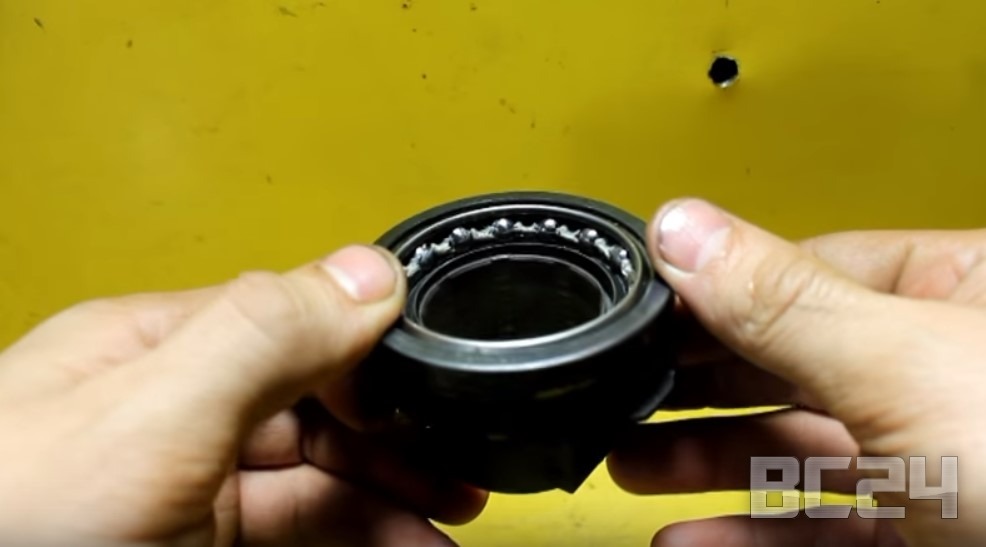 А вот выжимной подшипник. и смазки в нем, как вы видите, так же очень мало. В итоге, если его не смазать, то он начнет стучать уже при первых тысячах пробега.