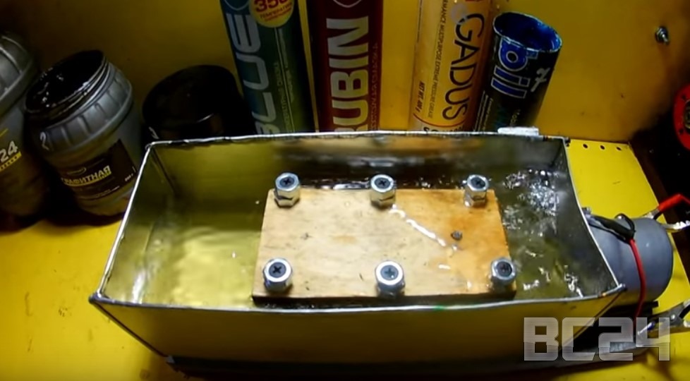 Установили в ванночку все подшипники и оставили на 2 дня. Запустили двигатель и через час вода стала маслянистой. Усложняем задачу — 1 час сделаем так, чтобы подшипники поработали без воды.
