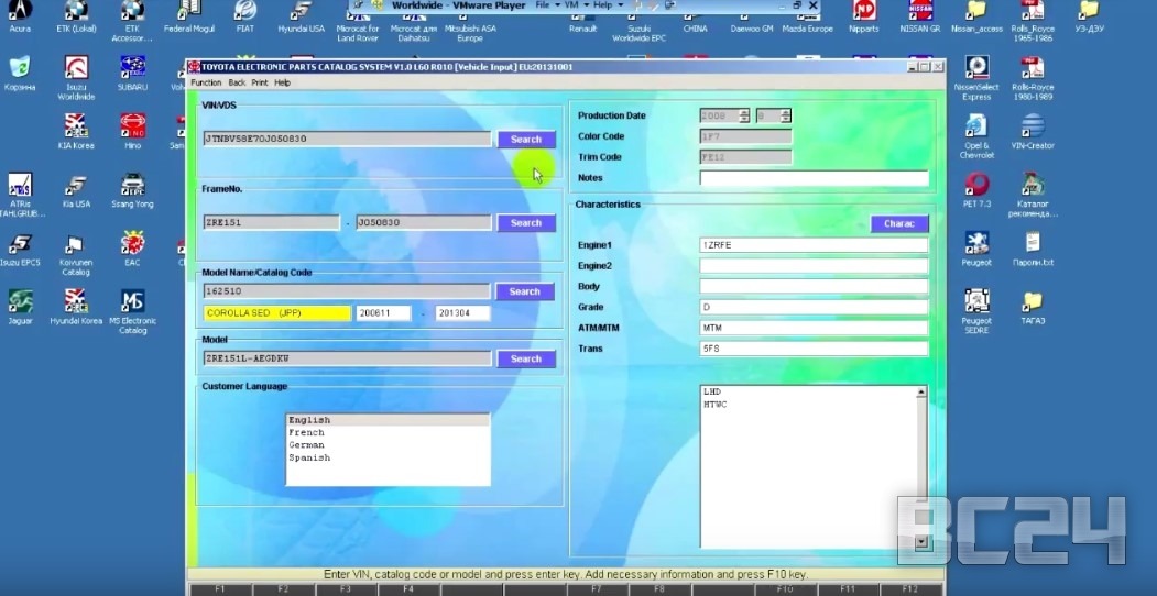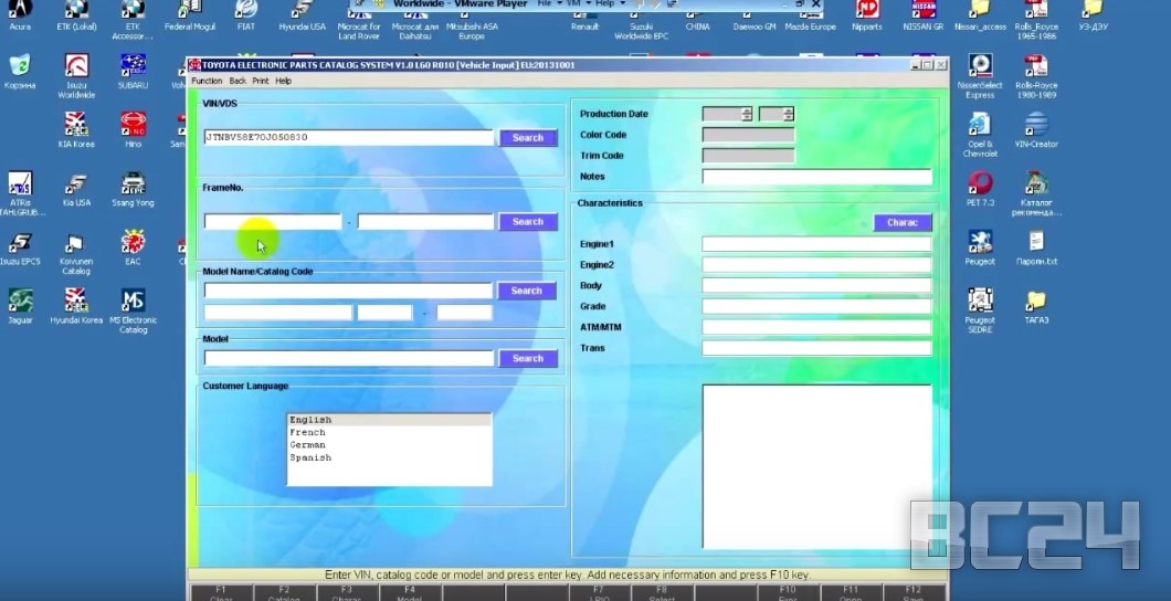 Заходим в программу с каталогами VMware Player. Запускаем программу Тойота и выбираем страну производителя.