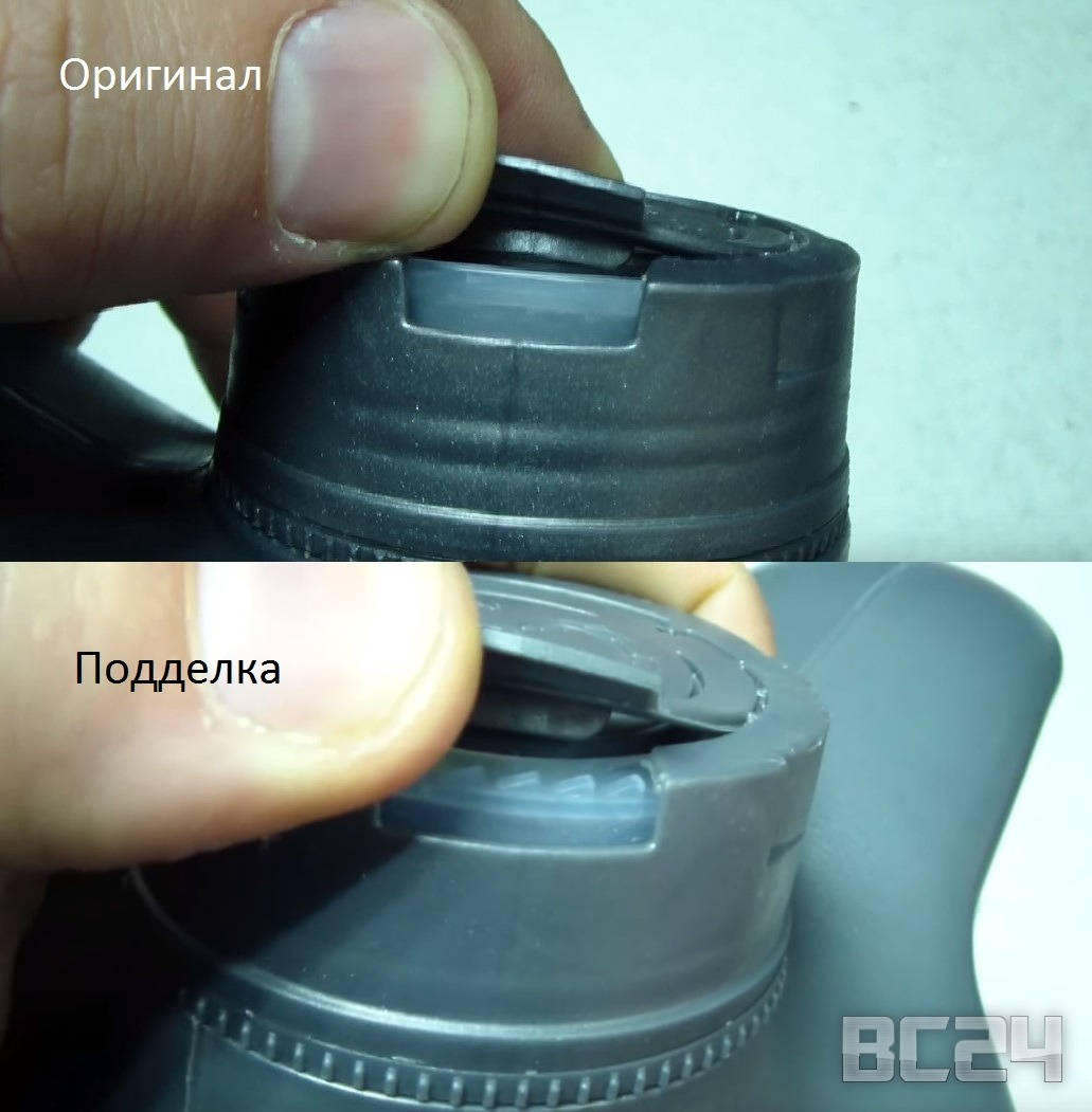 Особенностью производства канистр является спайка из 3-х частей: 2 половинки, горловина. На верху должен быть треугольный шов от спайки, его очень легко заметить. Шов идет вокруг горла. Подделка собирается из двух половинок и треугольника сверху нет.