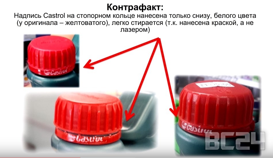 Крышка масла CASTROL обязательно должна плотно прилегать к пломбе и не должно быть никаких следов. Обращайте внимание на то, чтобы на крышке, а также на ее пломбе обязательно была нанесена надпись торговой марки CASTROL. И чтобы она была нанесена не только на пломбе, но и на крышке. Обратите внимание на фото контрафакта! На некоторых из образцов надпись есть только на самой пломбе. Может быть еще такой вариант, что надпись на крышке и пломбе смещена немного в сторону.