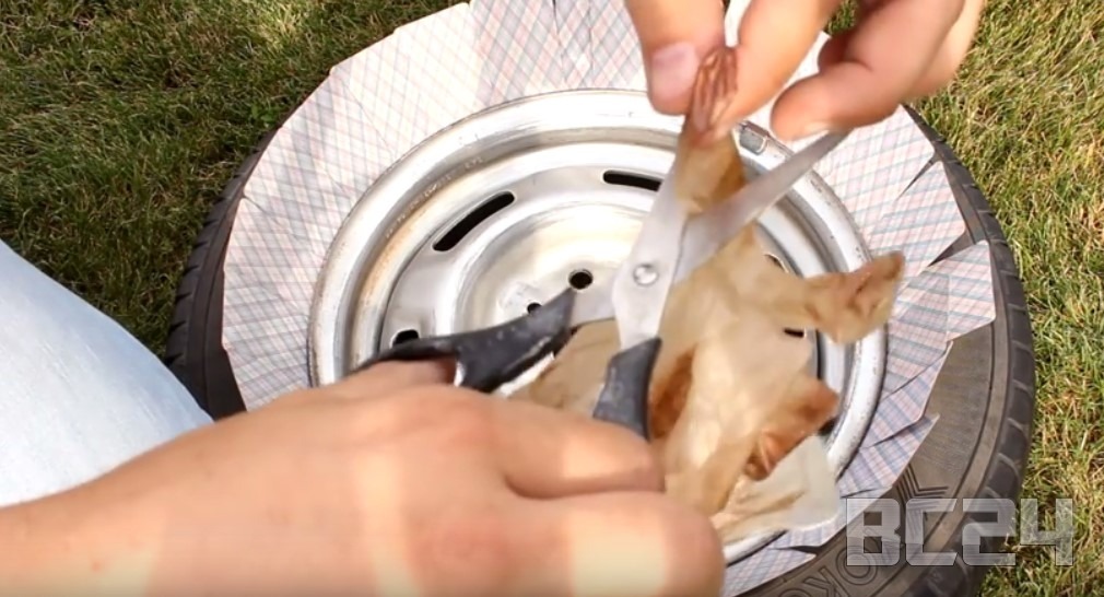 Воспользуемся картами, но не для того чтобы поиграть, а для защиты самой резины от попадания краски. Вставим карты по контуру диска. Теперь когда мы будем красить диск, краска не будет попадать никуда, кроме как на поверхность диска.